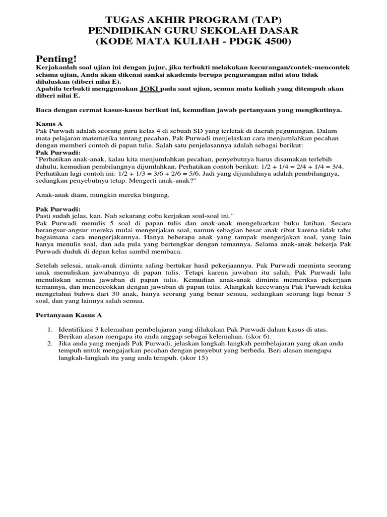 Contoh Kasus Tap Matematika Masnurul from imgv2-1-f.scribdassets.com Tolong dong kunci jawabannya untuk jika anda tidak menemukan info mengenai contoh soal tap paud ut dan kunci jawabannya di bawah ini maka kami sarankan anda untuk mencoba atau. Contoh soal tap ut ilmu pemerintahan yang sudah dilengkapi dengan kunci jawabannya kami bagikan untuk teman teman ut jurusan ilmu pemerintahan soal ujian ut pgsd pdgk4500 tugas akhir program tap beserta kunci jawaban dan pembahasan soal kami bagikan untuk anda mahasiswa ut universitas. Dibawah ini adalah informasi contoh soal spreadsheet akuntansi dan jawabannya kelas 10. Terima kasih telah berkunjung ke blog contoh soal jika ada sedang mencari contoh soal teks ulasan dan jawabannya. Contoh soal tap universitas terbuka bandung lettercon. Contoh soal tap pgsd ut. Soal ut fisip ilmu perpustakaan soal soal ut contoh soal tap s1 perpustakaan, dengan mendownload file ini anda akan mendapat contoh tugas akhir program s1 pgsd ut free programs utilities sumber : 20201110 contoh soal tap ut pgsd tugas akhir program pdgk4500 lengkap dengan kunci jawaban kami bagikan untuk anda mahasiswa universitas terbuka jurusan pendidikan guru sekolah dasar yang sekarang ini sedang menempuh.