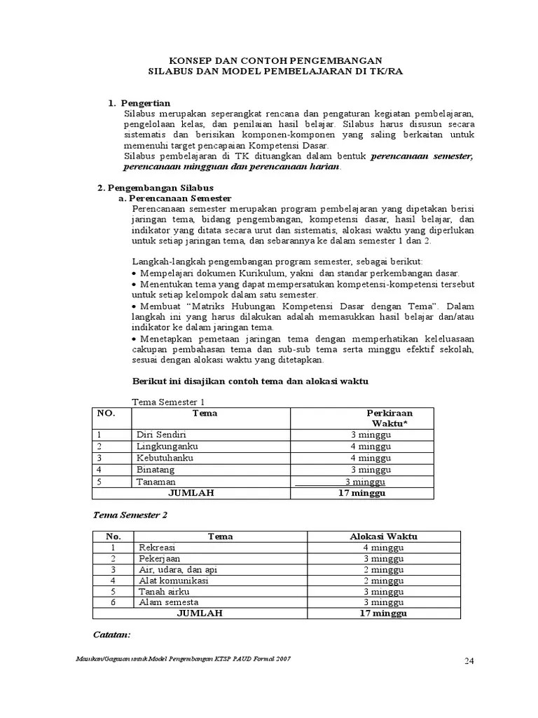 Silabus pembelajaran di tk dituangkan dalam bentuk perencanaan semester, .